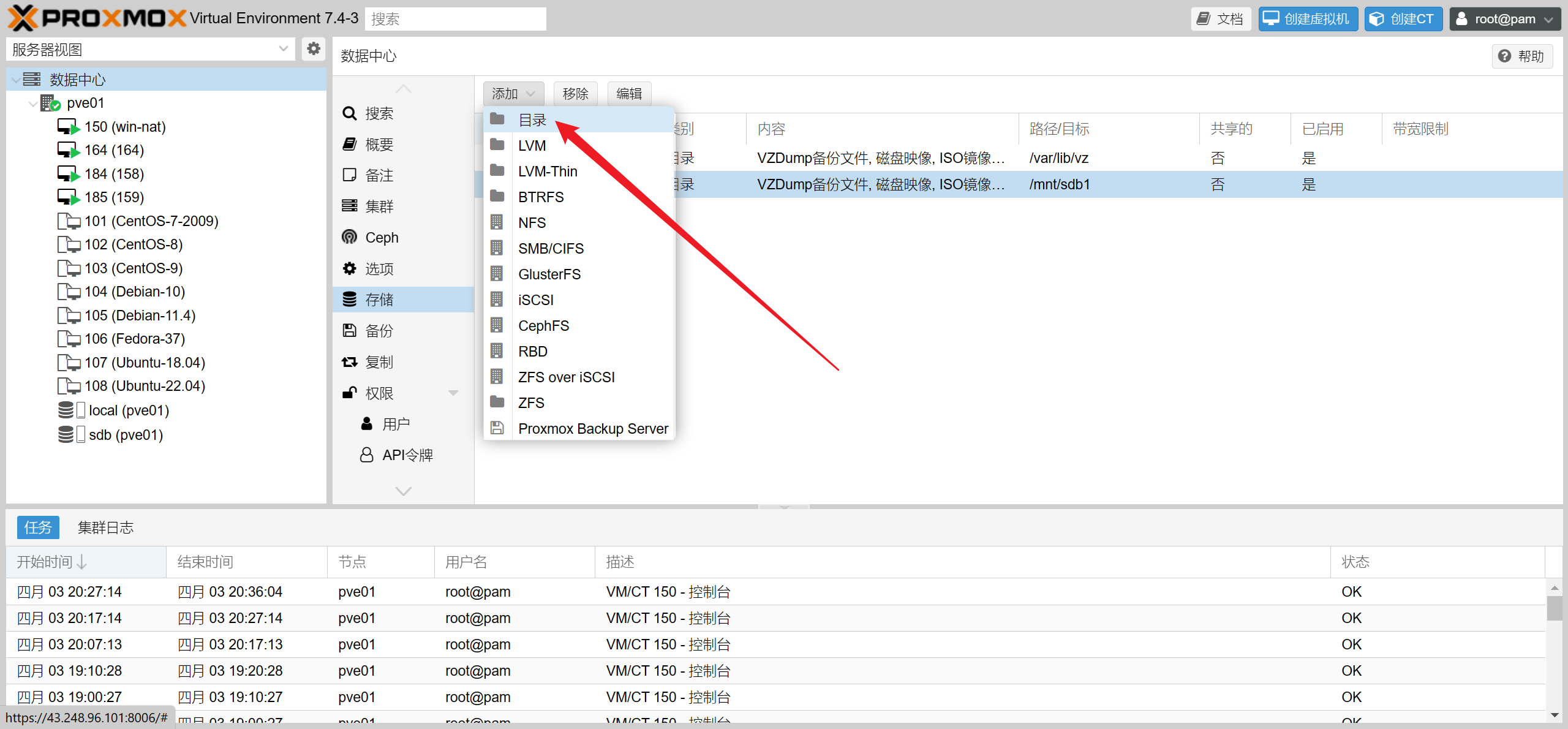 选择 “数据中心”(注意:不是选择 PVE),存储 >>> 添加 >>> 目录。![Proxmox VE(PVE)添加硬盘做存储 [引]](https://kuwi.net/wp-content/uploads/2024/04/post-809-6624acc12ca45.png)